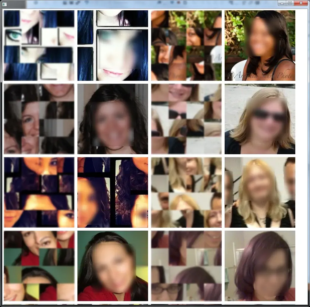At first glance, I thought the picture was generated from multiple pictures and selected for parts of the picture that had the person's face on it somehow. Upon closer inspection, I realized that the sub-pictures seemed to be connected somehow, and suspected that it was probably a form of a 15-puzzle and it would be pretty easy to unscramble. After trying it out manually in paint.net, I was able to unscramble one of the pictures within a few minutes. Most of the time was spent trying to figure out how to get it to split the image into 16 layers that I could individually drag around.