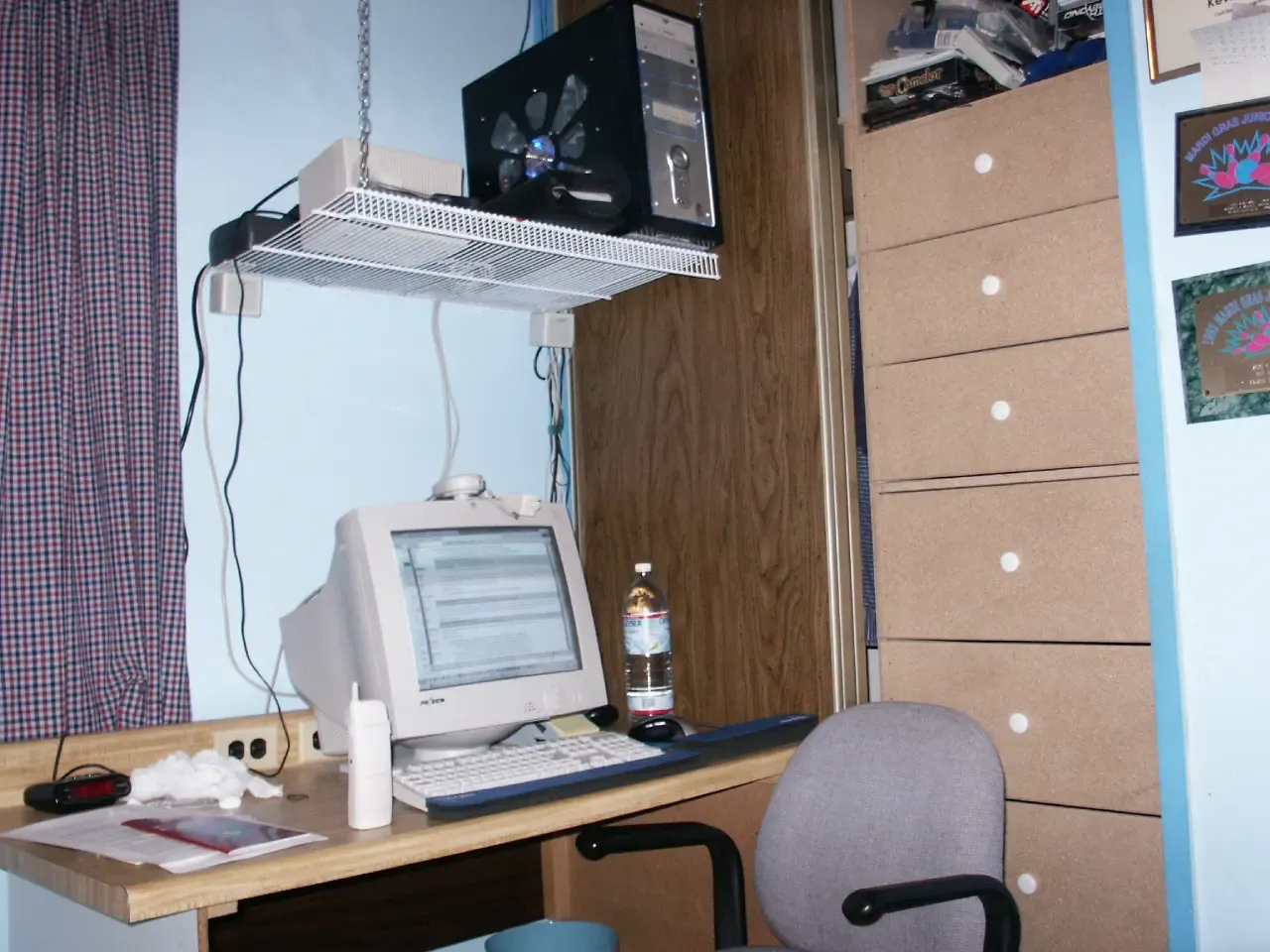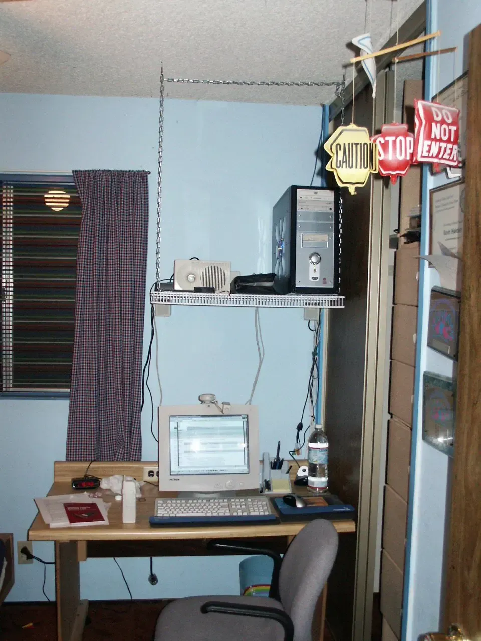 new shelf Also while he was here, he put a shelf up for my computer. It makes it much more convenient for my desk situation because it literally doubles the space I have. Now I can put my laptop on the desk as well as my monitor and mouse for my desktop. Too bad the only linux drivers for my 802.11b card are Red Hat only binaries and I've got Slackware on the router box I'd put it in. No amount of fidgiting would make that one work.
