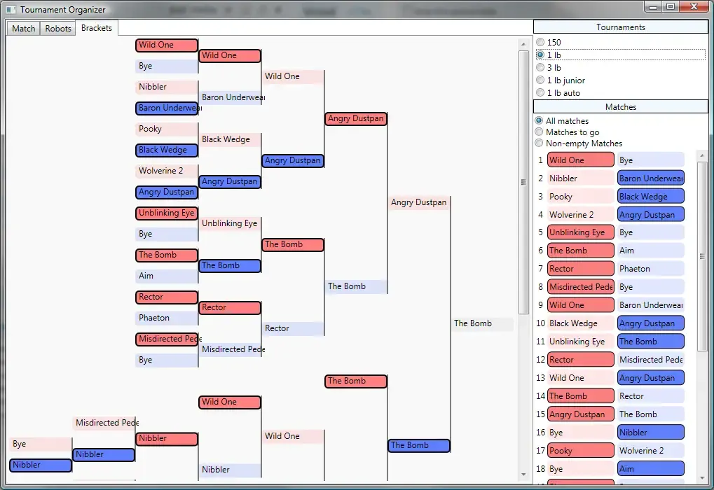 I know, I'm terrible at keeping up to date on these blog posts. What usually happens is there's something I want to post but don't want to take the time to do it right now and it gets permanently stuck in my queue of stuff to do. Then I want to post about something else but don't want to go out of order. Then it gets to be 9 months later and I post a large backlog of things. This is another one of those posts. After Defcon and Robogames last year, Joe and I were pretty tired of working on projects so we took some time off to do some non-project related things. It's a lot easier to get projects done when you're in college and only have to be at school 15-20 hours a week versus having full time job and obligated for 40+ hours a week. However, it's also nice being able to afford things rather than being stuck with a shoestring budget. I guess it's the old catch-22 of having enough time or enough money, never both. To celebrate my minimum spare time, I decided to remake the Tournament Software I use to run the robot tournaments with WPF (instead of PHP). The initial reasoning behind doing it in PHP was that was what I was most familiar with and that I wanted people in the pits to be able to look at the brackets, etc over wi-fi without having to bug me. However, that aspect never got used and the software was hard to work with if there was any problem whatsoever (entered match wrong, or someone shows up late). I've wanted to learn WPF for a while, and this was a good excuse to have a project to do that with.